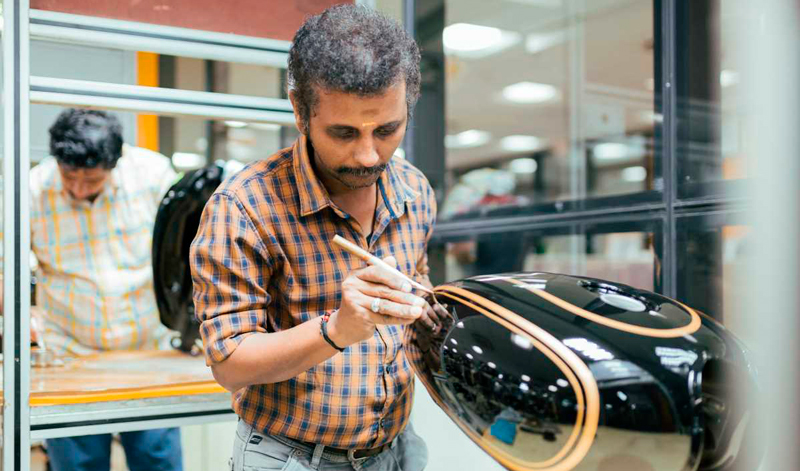 Está disponible en dos colores, Black y Maroon, con depósito -en forma de lágrima y de 13 litros-, tapas laterales y guardabarros con las líneas pintadas a mano y con logos cromados y dorados. La Bullet Black Gold (5.187 €) es la versión premium en color negro mate y de alto brillo en el depósito, con un logo 3D en cobre y oro, con finas líneas de color cobre y con el motor y los componentes oscurecidos.