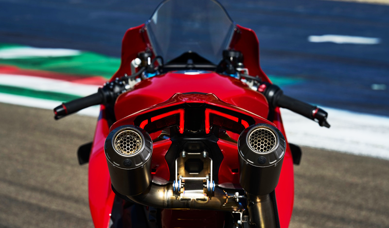 La Panigale V4 R puede alcanzar 240.5 hp en configuración de circuito cerrado con la combinación del escape de competición completo y el aceite Shell específico. El escape de competición está destinado a los vehículos que se utilizan únicamente en circuitos cerrados