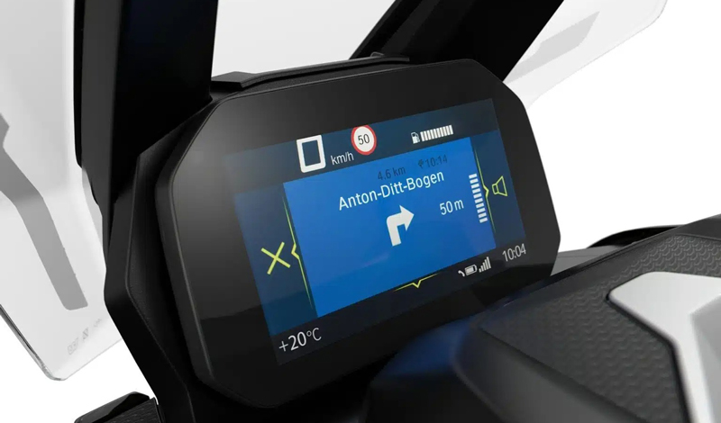 Otra novedad importante es la inclusión de una pantalla TFT de 6,5 pulgadas de serie, que, en combinación con la aplicación BMW Motorrad Connected, permite una integración completa con el multicontrolador ubicado en el manillar izquierdo. Esta pantalla ofrece una navegación intuitiva y acceso rápido a las funciones del scooter, todo ello de manera segura y cómoda mientras se conduce. Además, el C 400 X cuenta con más espacio bajo el asiento, aumentando en 3 litros su capacidad de almacenamiento, lo que lo hace aún más práctico para el día a día.