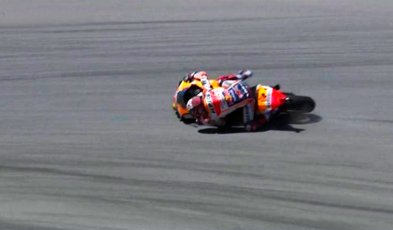 Doce vueltas antes de concluir la carrera, Marc Márquez se fue al suelo inmediatamente el piloto intento levantar la moto y remontar, pero fue imposible, el motor estaba parado y la carrera ya a punto de concluir. Un mal fin de semana para Honda, ya que Jorge Lorenzo también se retiró de la carrera por un problema mecánico que los ingenieros de Honda deben de solucionar pronto si desean que sus pilotos sean ganadores del Campeonato.