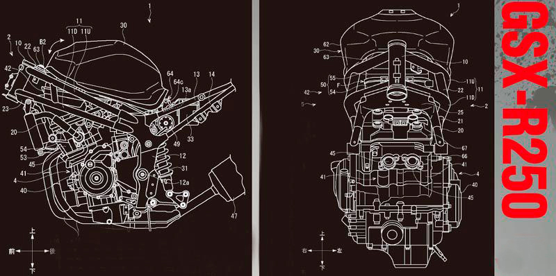 Salieron a la luz nuevas patentes de la marca japonesa en su fábrica originaria de Hamamtsu, en la cual se observa el desarrollo de una versión renovada de la GSX-R250. Es notable que su motor sería de dos cilindros paralelo, plus enfriado de agua.