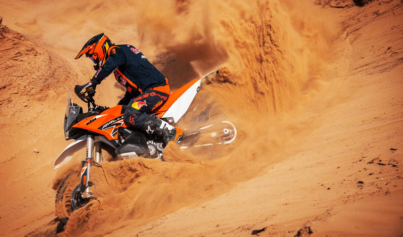 El motor KTM bicilíndrico paralelo de 889 cc ofrece 100 Nm de par a 6500 rpm y 105 CV de potencia, y se combina con componentes como el ligero sistema de escape Akrapovič Slip-on Line, similar al utilizado por los equipos de competición Factory de KTM. Con su sistema ABS Offroad, control de tracción, navegación TURN-BY-TURN+ y múltiples modos de pilotaje para elegir en función del terreno, la tecnología de la KTM 890 ADVENTURE R RALLY, con su instrumentación TFT de 5″, el TECH PACK y el kit de unidad de conectividad, hacen que esta moto esté preparada para viajar sin límites. Este modelo cuenta con un asiento Rally específico para competición, ruedas de alta resistencia con llantas Excel para los terrenos más duros, y estriberas Rally para aumentar la sensación y el agarre en los enlaces largos. También se montan protectores del depósito de gasolina de carbono combinados con una protección ampliada del motor, la bomba trasera y la suspensión. Monta también una corona trasera Supersprox-Stealth, así como un nuevo diseño inspirado en los rallys.