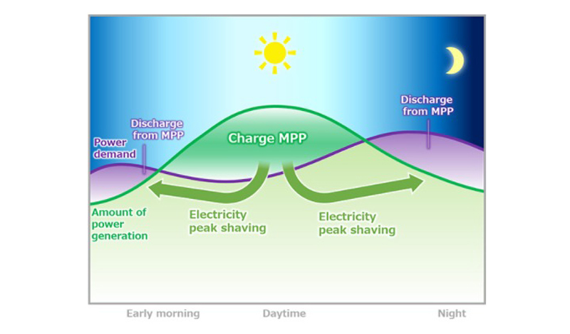 Con la ampliación del uso de MPP, será más fácil utilizar las energías renovables sensibles a las condiciones naturales. Por ejemplo, cuando se genera un exceso de electricidad durante las horas diurnas, mediante la generación de energía solar, el MPP servirá de amortiguador almacenando ese exceso de electricidad. Luego, durante las últimas horas de la tarde, cuando el suministro eléctrico no satisface la demanda, la electricidad almacenada en el MPP durante el día puede utilizarse para lograr un desplazamiento de carga máxima (o “reducción de pico” que reduce y suaviza las cargas pico) para reducir el tiempo de carga mediante la red eléctrica.