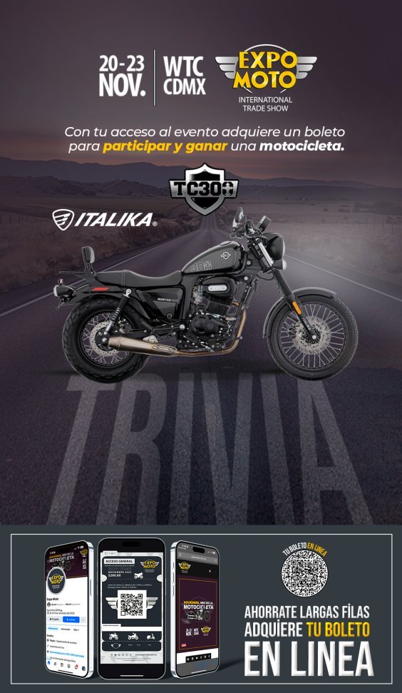 2016-05-28: Este correo electrónico y, en su caso, cualquier fichero anexo, contiene información exclusivamente dirigida a su destinatario. En caso de haber recibido este correo electrónico por error, se ruega notifíquese inmediatamente esta circunstancia a info@motociclo.com.mx Al mismo tiempo EXPO MOTO le recuerda que sus datos forman o formarán parte de un fichero registrado, propiedad de la EXPO MOTO. Usted tiene derecho de acceso, oposición, rectificación y cancelación a estos datos que deberá ejercer mediante escrito a la dirección anteriormente citada.Expo Moto es una marca registrada. Los logotipos de patrocinadores fueron proporcionados por la misma marca. Queda prohibido el uso de las imágenes difundidas en este correo. © 2013 EXPO MOTO Todos los derechos reservados.